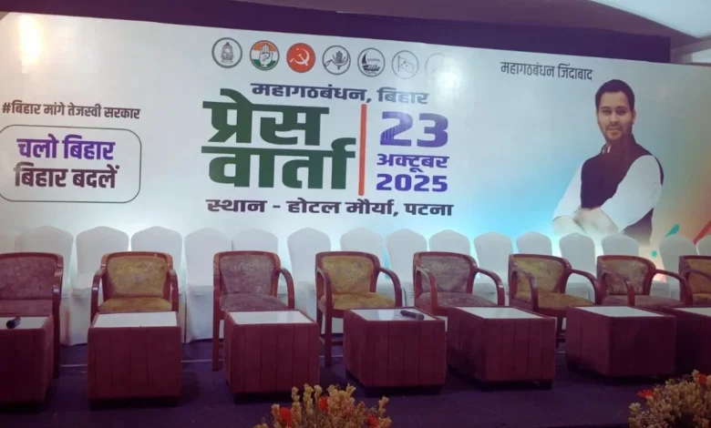 बिहार की राजधानी पटना में आज सुबह 11:30 बजे महागठबंधन की बड़ी प्रेस कॉन्फ्रेंस होनी है. इसमें तेजस्वी यादव को महागठबंधन के मुख्यमंत्री के चेहरे के रूप में पेश किया जाएगा. प्रेस कॉन्फ्रेंस का जो मंच तैयार किया गया है, वहां पोस्टर में सिर्फ तेजस्वी यादव का चेहरा है. इसके साथ ही महागठबंधन को लेकर जो भी सस्पेंस हैं, वो खत्म हो जाएंगे. प्रेस कॉन्फ्रेंस में साझा चुनावी कार्यक्रम की भी घोषणा की जाएगी.