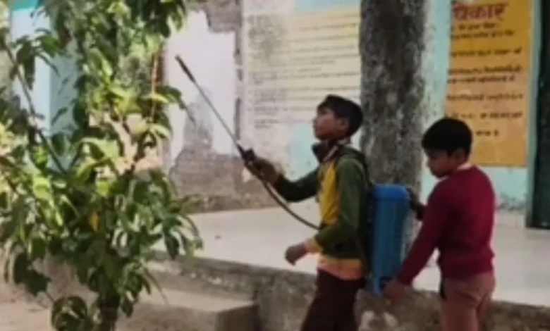 उत्तर प्रदेश के मुरादाबाद जिले की ठाकुरद्वारा तहसील के आसलेमपुर गांव से एक हैरान करने वाला एक वीडियो सोशल मीडिया पर वायरल हो रहा है. यह वीडियो सिर्फ लापरवाही की तस्वीर नहीं, बल्कि मासूम बच्चों की जान के साथ खुलेआम खिलवाड़ का सबसे खतरनाक उदाहरण बन गया है. वायरल वीडियो में सरकारी स्कूल के 10-12 साल के बच्चे अपनी पीठ पर कीटनाशक दवा की भार ड्रम लटकाए पेड़ों पर स्प्रे करते दिख रहे हैं.