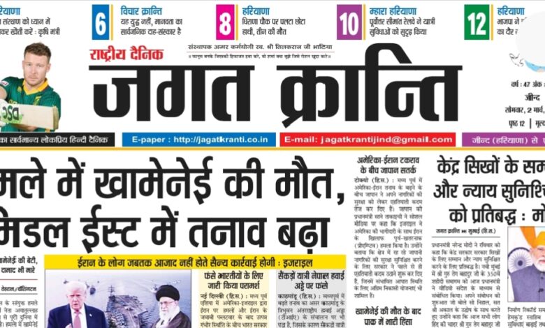 Home/हरियाणा संस्करण/दैनिक जगत क्रान्ति हरियाणा दिनांक 02/03/2026 हरियाणा संस्करण दैनिक जगत क्रान्ति हरियाणा दिनांक 02/03/2026 Arun Bhatia Send an email March 2, 2026 10 Less than a minute Tags# jagat Kranti jind Haryana #jagatkranti Epaper jagat kranti Haryana hindi newspaper Hindi epaper National hindi newspaper Arun Bhatia Send an email March 2, 2026 10 Less than a minute