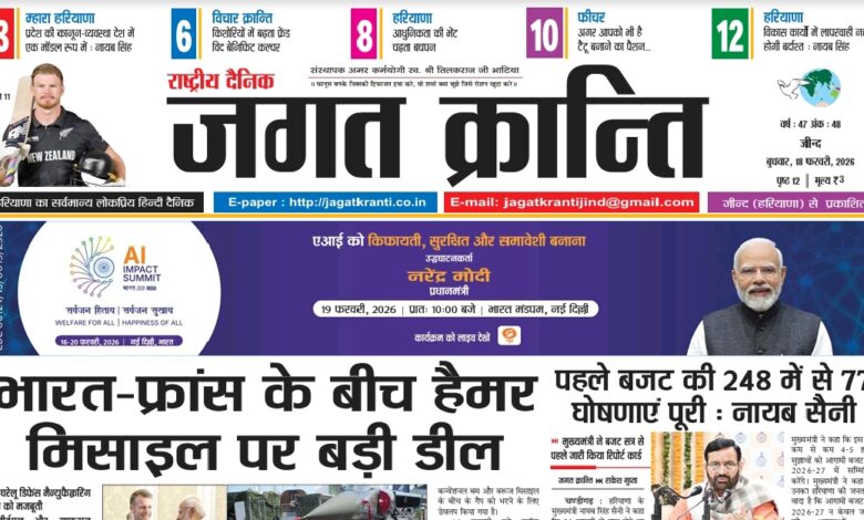 Home/हरियाणा संस्करण/दैनिक जगत क्रान्ति हरियाणा दिनांक 18/02/2026 हरियाणा संस्करण दैनिक जगत क्रान्ति हरियाणा दिनांक 18/02/2026 Arun Bhatia Send an email February 18, 2026 18 Less than a minute Tags# jagat Kranti jind Haryana #jagatkranti Epaper jagat kranti Haryana hindi newspaper Hindi epaper National hindi newspaper Arun Bhatia Send an email February 18, 2026 18 Less than a minute