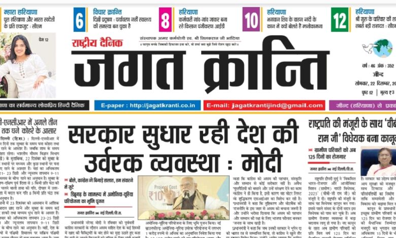 Home/हरियाणा संस्करण/दैनिक जगत क्रान्ति जीन्द हरियाणा, दिनांक 22/12/2025 हरियाणा संस्करण दैनिक जगत क्रान्ति जीन्द हरियाणा, दिनांक 22/12/2025 Arun Bhatia Send an email December 22, 2025 72 Less than a minute Tags# jagat Kranti jind Haryana #jagatkranti Epaper jagat kranti Haryana hindi newspaper Hindi epaper National hindi newspaper Arun Bhatia Send an email December 22, 2025 72 Less than a minute