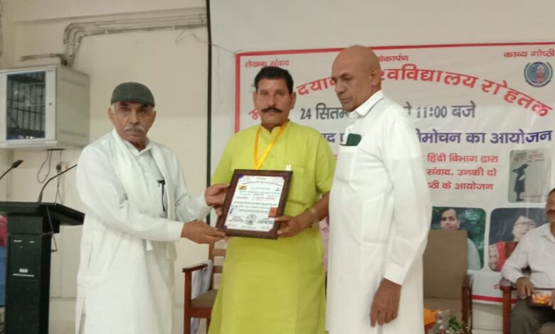 रोहतक, (ब्यूरो): महर्षि दयानदं विश्वविद्यालय रोहतक में कार्यक्रम का आयोजन किया गया। कार्यक्रम में पुस्तक का विमोचन करते हुए विशिष्ट अतिथि म्हारी संस्कृति म्हारा स्वाभिमान संगठन के राष्ट्रीय अध्यक्ष हनुमान कौशिक ने कहा कि अशोक कुमार जाखड़ ने अपनी लेखनी से तैयार की गई पुस्तक में हरियाणवी संस्कृति और साहित्य को बढ़ावा दिया है। उन्होंने अपनी पुस्तक में संगीत संस्कृति और साहित्य को इस कदर संजोया है जो युवाओं को अंदर से प्रेरित करेगी। जिससे समाज में बदलाव की ब्यार आएगी। उन्होंने कहा कि आज के समय में अति आवश्यक है कि युवाओं को साफ सुथरी संस्कृति से अवगत करवाया जाए। जब युवा हमारी संस्कृति को पहचान कर उसके अंदर अपने आपको ढालेगा तो एक सभ्य समाज की संरचना होगी। इस अवसर पर डा. सुशीला जांगड़ा, सुनील शर्मा उमरावत, कवि श्रीनिवास लाखन माजरा, कवि रघुवीर मदीना, कवि सत्यवीर निराला, नैतिक, धर्मवीर नागर, संदीप कथुरा, महेन्द्र बिलोतिया आदि उपस्थित रहे।