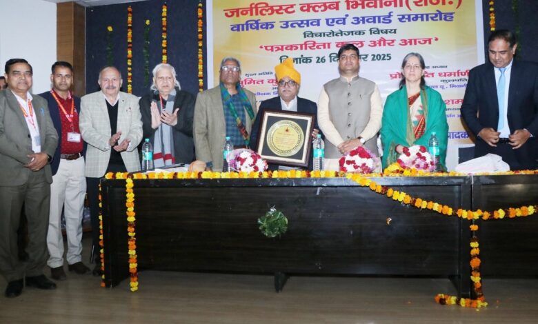 भिवानी,(ब्यूरो): जर्नलिस्ट क्लब भिवानी द्वारा वार्षिक उत्सव एवं अवॉर्ड समारोह के मुख्य अतिथि पुलिस अधीक्षक सुमित कुमार ने कहा कि पत्रकारिता लोकतंत्र का चौथा स्तंभ है। पत्रकारिता का देश की आजादी में महत्वपूर्ण योगदान रहा है। उन्होंने कहा कि आज की पत्रकारिता में अनेक बदलाव आए हैं। आज आर्टिफिशियल इंटेलिजेंस का दौर है। ऐ-आई के कारण अनेक बदलाव देखने को मिल रहे हैं। उन्होने कहा कि पत्रकार राष्ट्र एवं समाज हित में सही रिपोर्टिंग करें। अब समय आ गया है कि पत्रकार अपनी दिशा खुद की तय करनी है। आज भी आम आदमी अखबार में छपी खबरों पर विश्वास करता है। इसलिए पत्रकारिता की दिशा तेजी से बदल रही है। क्योकि प्रकृति के साथ बदलाव अटल नियम है। कार्यक्रम की अध्यक्षता करते हुए कुलगुरु प्रोफेसर दीप्ति धर्माणी ने कहा कि विश्वविद्यालय में 65 प्रतिशत बेटियां पढ़ती हैं जिनको सुरक्षा प्रदान करने के लिए पुलिस अधीक्षक एवं प्रशासन का आभार व्यक्त किया। पर्यावरण एवं जलवायु परिवर्तन आयोग के अध्यक्ष भारत शर्मा ने कहा कि पर्यावरण संरक्षण हम सभी की नैतिक जिम्मेदारी है। उन्होंने पत्रकारों से आह्वान किया कि वे पर्यावरण एवं जलवायु के मुद्दों को तत्परता से उठाएं। पूर्व विभागाध्यक्ष प्रोफेसर डाक्टर हरीश कुमार ने कहा कि देश की आजादी में पत्रकारों एवं पत्रकारिता का बहुत बड़ा योगदान रहा है। उन्होंने पत्रकारिता के कल और आज के बदलावों पर चरणबद्ध तरीके से प्रकाश डाला। जर्नलिस्ट क्लब भिवानी के प्रधान ईश्वर धामु ने पत्रकारिता के बदलाव एवं क्लब द्वारा संचालित कार्यक्रमों की विस्तृत जानकारी दी। संपादक श्रीभगवान वशिष्ठ ने पत्रकारिता पर कहा कि लोकतंत्र की दृष्टि से पत्रकारिता सदैव मजबूत रही है लेकिन आर्थिक दृष्टि से कमजोर रही है। उन्होंने अपने पिताश्री देवव्रत वशिष्ठ का विस्तृत जीवन परिचय प्रस्तुत किया। दैनिक गुडग़ांव टुडे के संपादक अनिल आर्य को 7वें देवव्रत वशिष्ठ स्मृति पुरस्कार से सम्मानित किया गया। इस अवसर पर बीजेपी के राष्टीय परिषद के सदस्य शंकर धूपड़, विजय गोठडा, नन्द किशोर अग्रवाल, हर्षदीप डुडेजा, भाजपा नेत्री बबीता तंवर, एडवोकेट शिवरत्न गुप्ता, कमल प्रधान, शिक्षा बोर्ड के पूर्व चेयरमैन वीपी यादव, डॉक्टर सतीश आर्य, रमेश सैनी, विजय सिंहमार, रंगकर्मी कौशल भारद्वाज सहित अनेक गणमान्य नागरिक उपस्थित रहे।