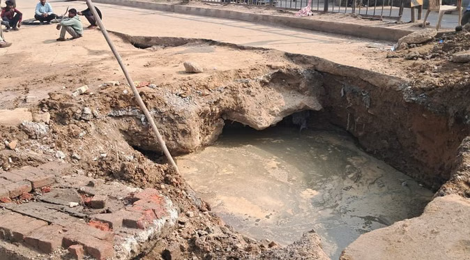हनुमान गेट चौक पर मुख्य लाइन धंसने से सड़क के बीचोंबीच गहरा गड्ढा बन गया है। इससे गुजरने वाले वाहनों के लिए स्थिति बेहद खतरनाक हो गई है। हिट एंड रन सड़क सुरक्षा कानून समिति के सदस्य एवं सड़क सुरक्षा कार सेवा अभियान के सूत्रधार अशोक कुमार भारद्वाज ने बताया कि हनुमान गेट क्षेत्र में पानी और सीवर लाइन की लीकेज के कारण गहरा गड्ढा बन गया है। नेशनल हाईवे की सड़क का बड़ा हिस्सा टूट चुका है जिससे भारी वाहन इसके पास से गुजरते समय फंसने या पलटने का खतरा बना हुआ है।