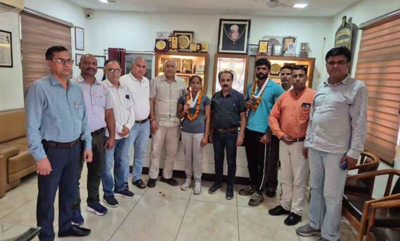 भिवानी, (ब्यूरो): विधार्थियों के सर्वांगीण विकास में खेलों की अहम भूमिका होती है। विधार्थियों को चाहिए कि वो एकाग्रता से कड़ी मेहनत करते हुए खेलों के क्षेत्र में आगे बढ़े।पूर्व में भी अंतरराष्ट्रीय स्तर पर देश का नाम चमकाने में वैश्य महाविद्यालय के खिलाडिय़ों की बड़ी भूमिका रही है यह बात स्थानीय वैश्य महाविद्यालय भिवानी में महाविधालय के खिलाडिय़ों शबनम एवं प्रमोद द्वारा कुरुक्षेत्र में आयोजित 12वीं हरियाणा स्टेट ओपन सीनियर एथलीट चैंपियनशिप में क्रमश: रजत एवं कांस्य पदक प्राप्त करने के पश्चात महाविद्यालय लौटने पर उन्हें सम्मानित करते हुए महाविद्यालय के प्राचार्य डॉ.संजय गोयल ने कही। उन्होंने कहा कि इस तरह की प्रतियोगिता में भाग लेकर पदक जीतना बहुत ही सराहनीय कार्य है। महाविधालय के खिलाडिय़ों शबनम एवं प्रमोद की इस सफलता पर वैश्य महाविद्यालय ट्रस्ट के अध्यक्ष एडवोकेट शिवरतन गुप्ता, महासचिव डॉ पवनबुवानीवाला वैश्य महाविद्यालय प्रबन्धक समिति के प्रधान अजय गुप्ता ,महासचिव भिवानी के विधायक घनश्याम सर्राफ, कोषाध्यक्ष बृजलाल सर्राफ, ट्रस्टी विजयकिशन अग्रवाल ने उसे बधाई दी। महाविद्याालय के खेल इंचार्ज भूपेंद्र भुप्पी ने बताया की 12वीं हरियाणा स्टेट ओपन सीनियर एथलीट चैंपियनशिप का आयोजन