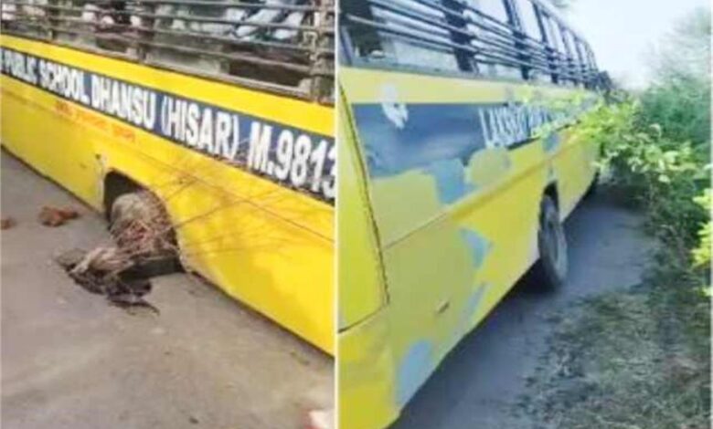 हिसार में स्कूल बस का टायर फंसा, 50 बच्चे सवार; ड्राइवर पर लापरवाही का आरोप