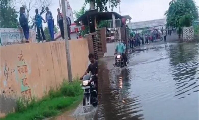दीवार पर चढ़कर स्कूल पहुंच रहे स्टूडेंट्स, बारिश के कारण स्कूल के सामने जमा हुआ पानी